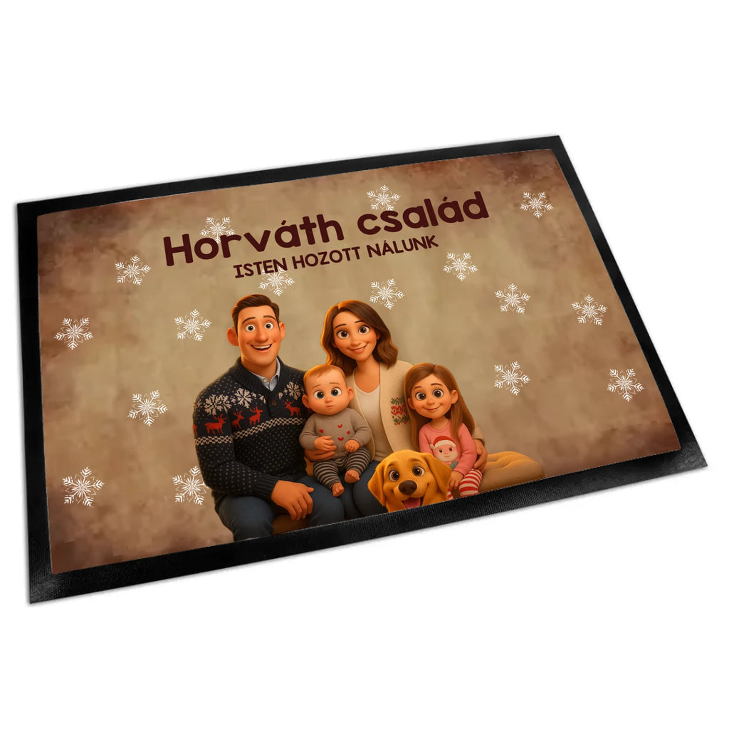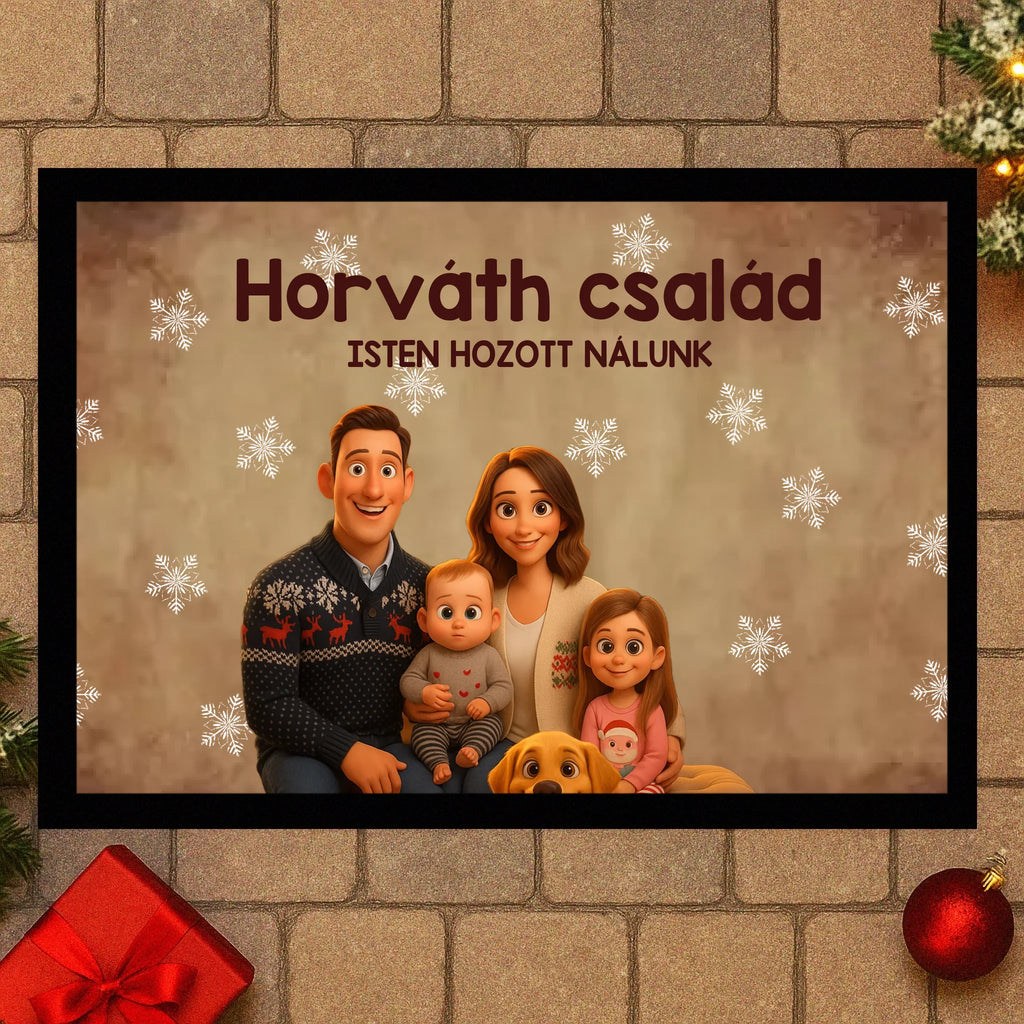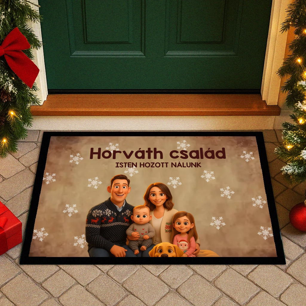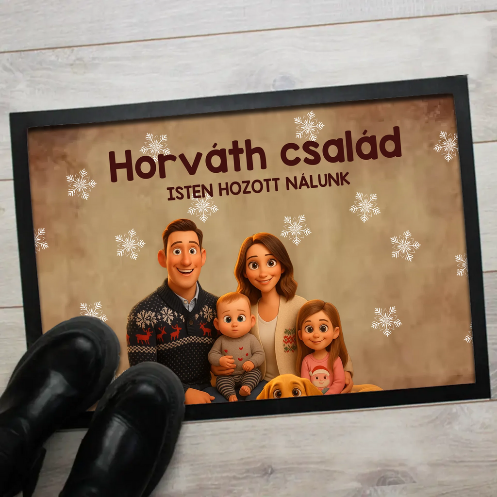 Egyedi családi karácsonyi lábtörlő – fotó alapján készült karakterekkel