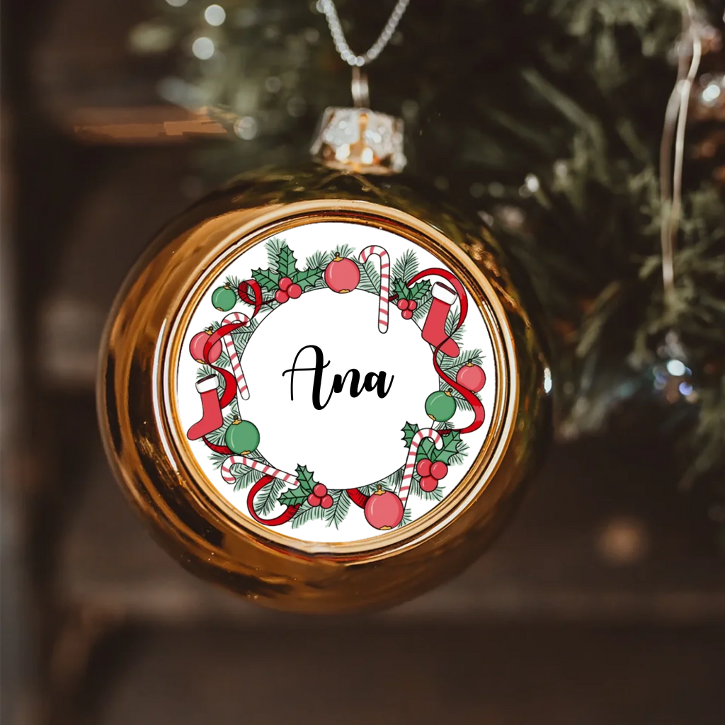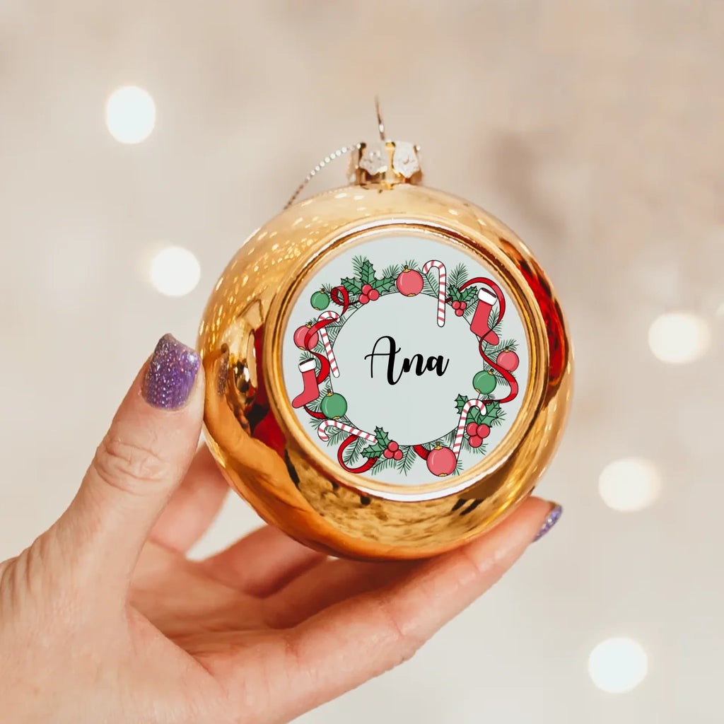 Zlatna personalizirana kuglica s imenom i božićnim vijencem
